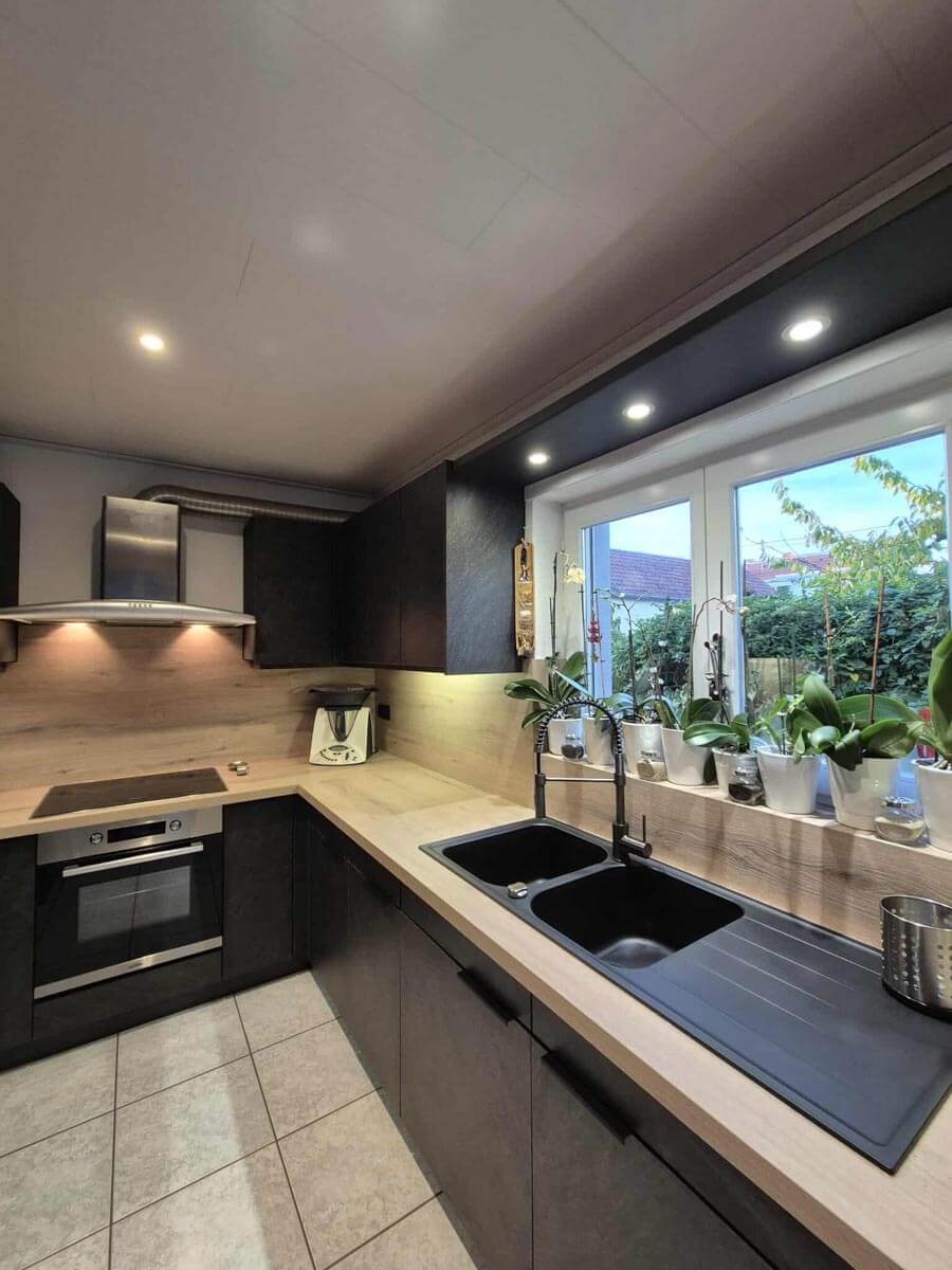 Rénovation complète d’une cuisine Rénovation complète d’une cuisine avec fabrication et pose des éléments sur mesure pour un rendu moderne et élégant : remplacement des portillons, plan de travail, crédence, habillage des caissons, …